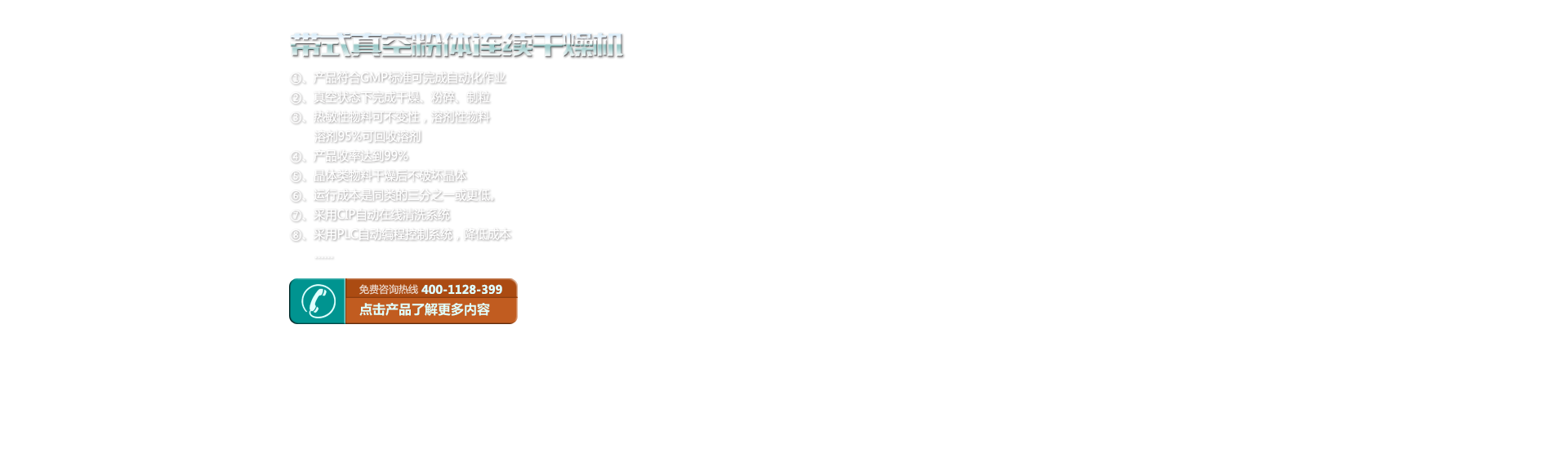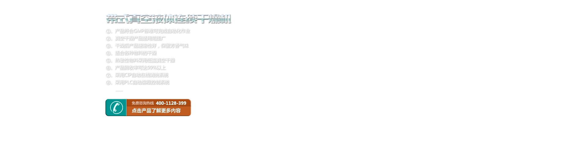 該機為提醇的高濃度、高粘度的中藥浸膏解決了一大難題,以往采用離心噴霧,因為溫度,熱敏性成份遭破壞、易粘壁;采用真空烘箱因時間長、能耗高、易染菌、易返潮,無法連續(xù)生產(chǎn),均達不到GMP質(zhì)量標準。 本機克服上述存在的許多問題,即干燥溫度低,有效成分不流失,干燥時間短、能耗低、無污染,能連續(xù)生產(chǎn)。