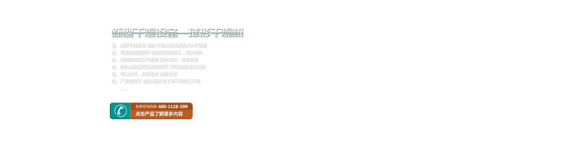 球形干燥設(shè)備 混合.干燥.清洗無死角.GMP設(shè)備 可加熱貼面攪拌 另加安裝破碎刀,減少結(jié)塊 較高的有效工作容積 混合均勻,沒有死角 物料.清洗液可以完全排盡 CIP在線全方位清洗 可以全開,方便檢查 清洗方便 廣泛適用于 食品.醫(yī)藥.化工 等干燥加工行業(yè) 設(shè)備模擬流程 設(shè)備選型 技術(shù)參數(shù) HCQG球形干燥機